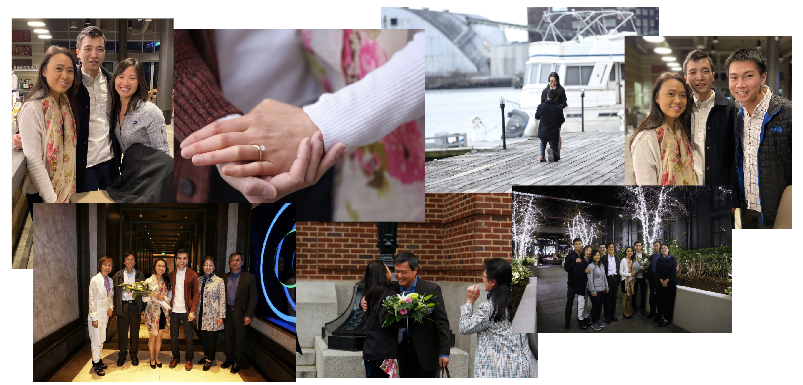 Stephen suggested a walk by the water before dinner in Fells. Shannon didn’t want to because it was “cold” but Stephen convinced her to go on a short walk before going to the restaurant. At the waterside, Stephen got on one knee and proposed, and Shannon said yes!